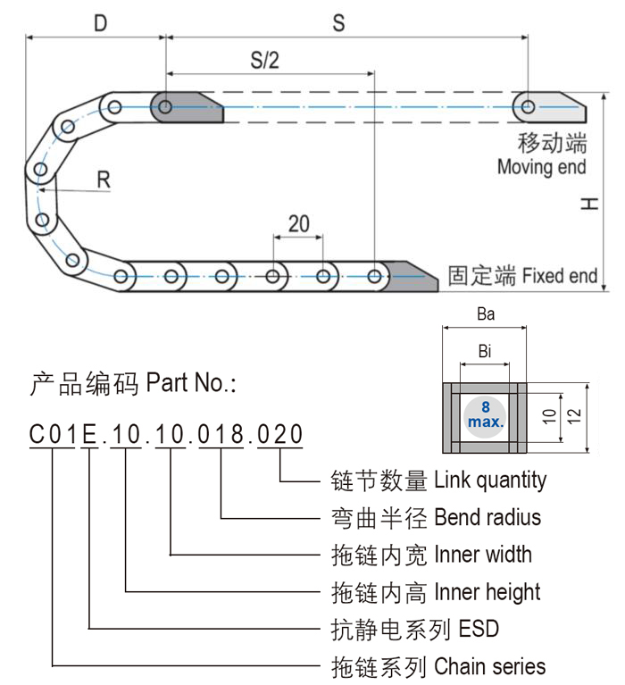 C01E.10抗靜電微型塑料拖鏈體積極小,基于一片式設(shè)計(jì)重量輕特別適用于高速運(yùn)動(dòng)。C01E.10抗靜電微型塑料拖鏈適用于較小安裝空間,多種尺寸規(guī)格可選。