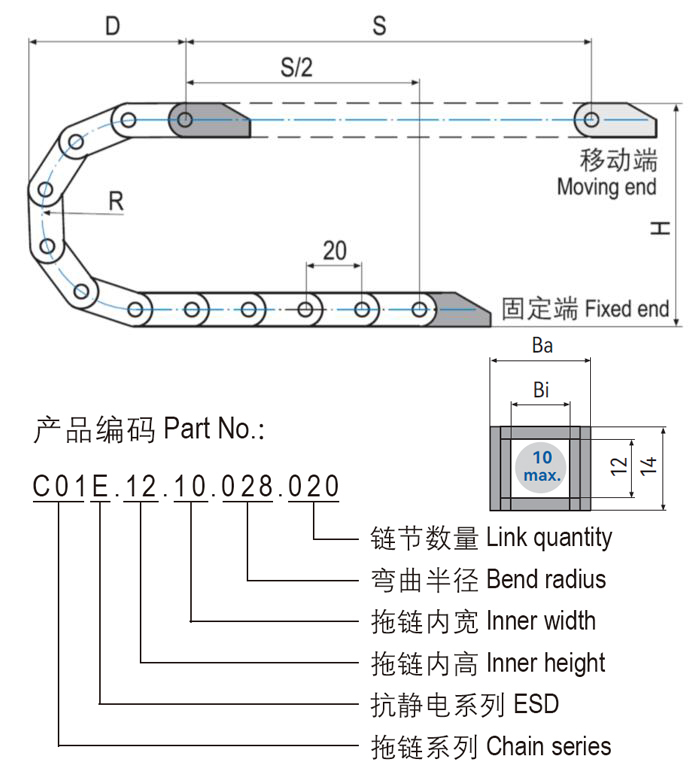 C01E.12抗靜電微型塑料拖鏈體積極小,基于一片式設(shè)計(jì)重量輕特別適用于高速運(yùn)動(dòng)。C01E.12抗靜電微型塑料拖鏈適用于較小安裝空間,多種尺寸規(guī)格可選。